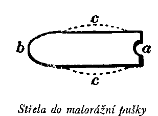 Nejlepší podmínky přesné střelby z pušek rýhovaných jakýmkoli způsobem jsou tyto: vývrt má mít průměr 0,5 palce, délka střely má být 1,12 palce, 1 otočka neboli závit má připadat na 18 palců, váha prachové náplně má být 90 až 100 granů (čís. 6), váha střely zůstává stejná, tj. 530 granů. Síla působící za těchto podmínek na plochu průřezu střely je relativně větší, takže střela je ve vývrtu jistě a spolehlivě utěsněna; dochází k tomu proto, že při zmenšeném průměru vývrtu je střela delší, a není tedy zapotřebí dřevěné zátky, která by kov rozšiřovala, jak je tomu u vojenských střel. Střela je tedy homogenním celkem o délce asi tří průměrů. Při explozi působí expanzívní síla prachu nejprve na konec čili zadní část střely (a), avšak přenos pohybové síly, i když nastává téměř okamžitě, naráží na vis inertiae[a] kovové hmoty střely, na odpor, působící po celé délce (od a do b) a zesílený odporem vzduchu v hlavni. Na první pohled je jasné, že se tento odpor musí projevit ve střední části střely, tedy v místě největšího odporu (c); střela se v tomto místě zcela přirozeně rozšiřuje a tudíž i poněkud zkracuje, řekněme asi o desetinu palce, zatímco střední část zvětšuje svůj průměr do té míry, že to stačí, aby se hermeticky utěsnila podle tvaru vnitřku hlavně, ať je tento tvar jakýkoli.