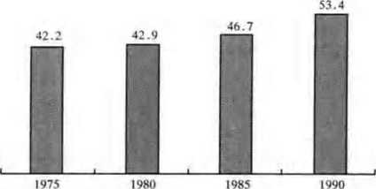 图3-2 1975~1990年间妇女工资历占男人工资的百分比