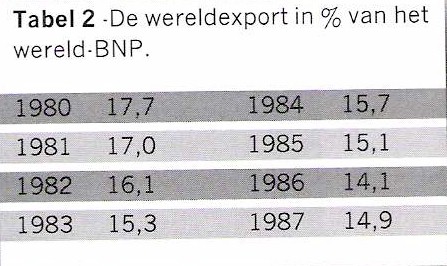 Maar vermits de Derdewereldlanden tegelijkertijd verplicht zijn om hun import op drastische wijze te beperken en vermits de koopkracht zowel in de Derde Wereld als in de metropolen daalt, hebben we te maken met een onophoudelijke relatieve inkrimping van de wereldhandel.